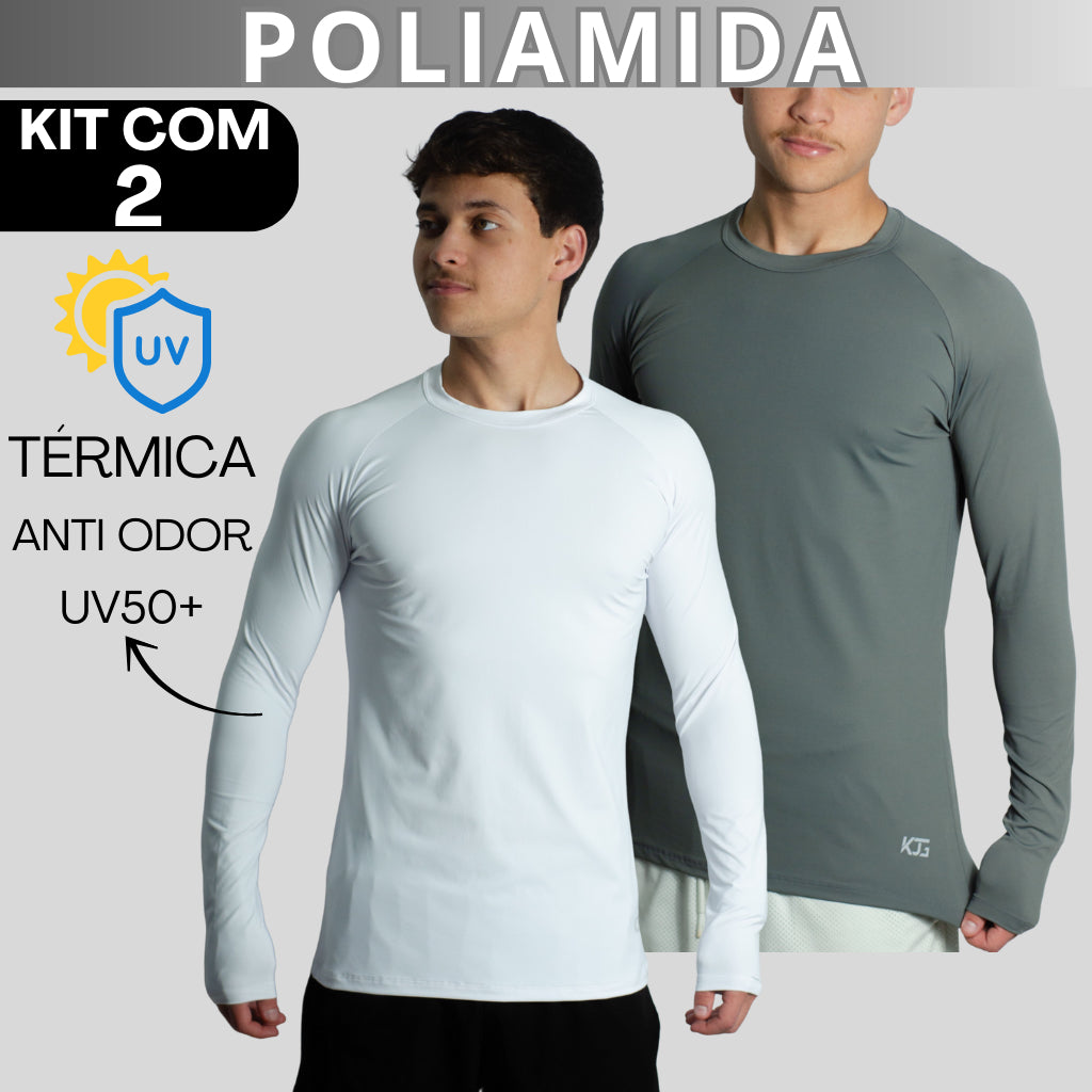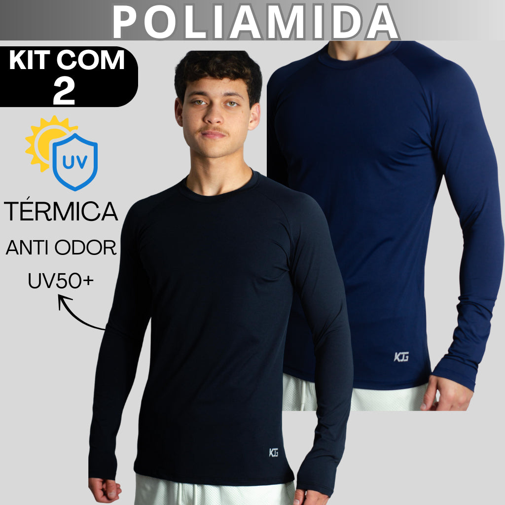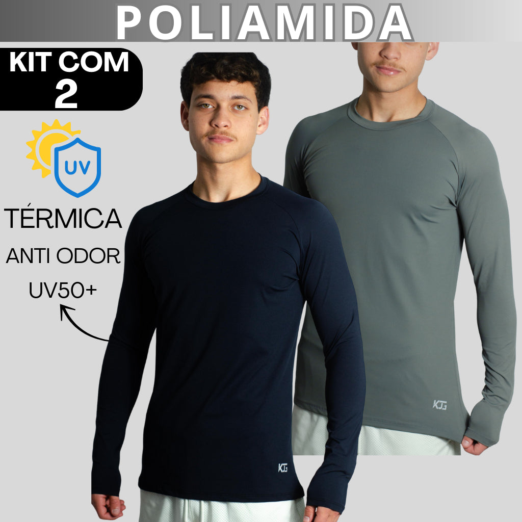 Kit com 2 Camisetas Masculina Segunda Pele Manga Longa Raglan em Poliamida – UV50+, Térmica e Anti Odor – KJG