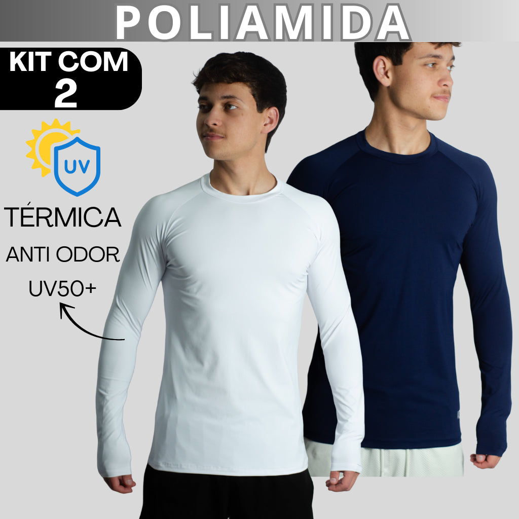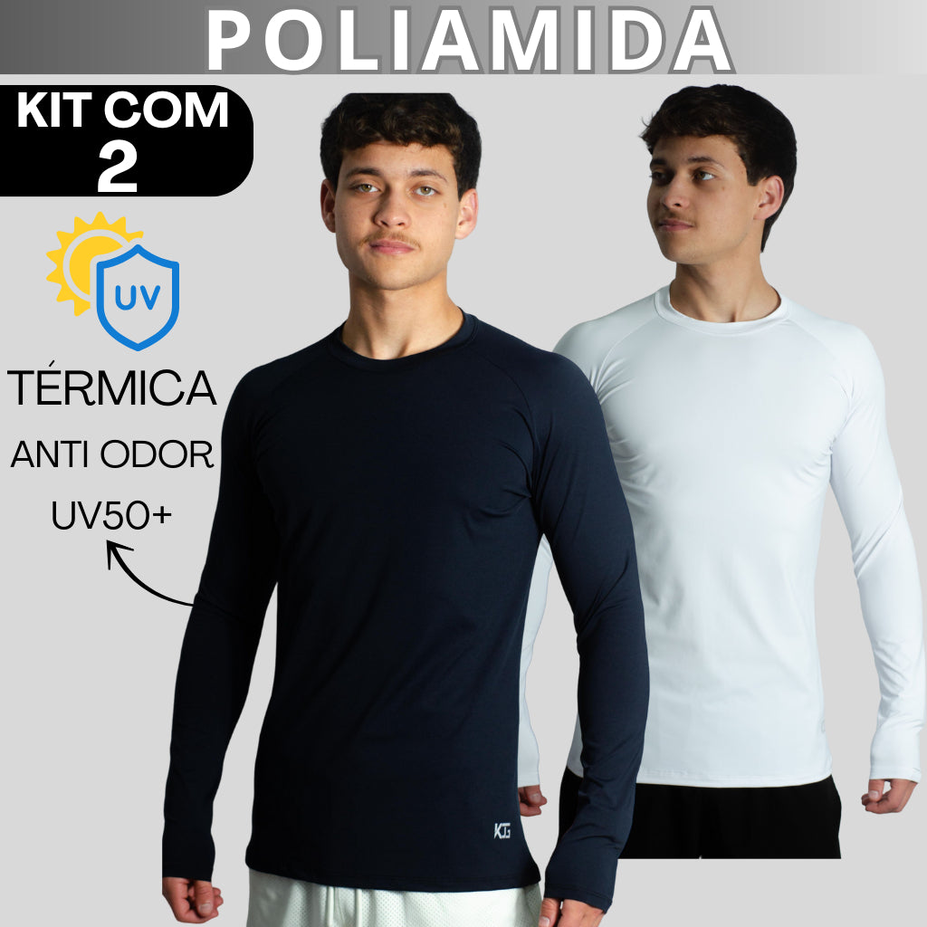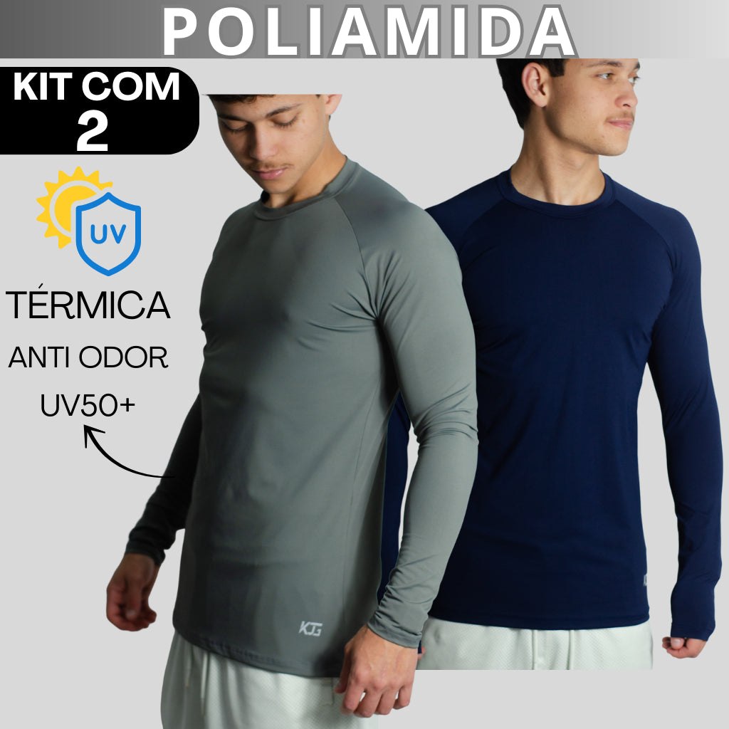 Kit com 2 Camisetas Masculina Segunda Pele Manga Longa Raglan em Poliamida – UV50+, Térmica e Anti Odor – KJG